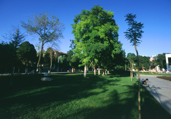 傍晚,当黄昏映着这片黄土地时,师大的操场显得格外安逸,放下忙碌了一天的疲倦身子,沿着这样一个被绿树裹着的林荫道,听着耳边喇叭里陈奕迅的《好久不见》,你会觉得自己好像也曾和这落日一同经历了生命中不再有的一天……明天一样很美好!留学生仍旧骑着单车,操场上的情侣依旧诉说着他们自己的小故事,还有一些勤奋的孩子照旧不舍自己的“之乎者也”。