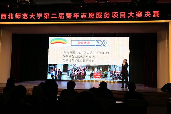 近日,我校“青春志愿行 共筑中国梦”——第二届青年志愿服务项目大赛决赛在学生发展中心举行。共青团甘肃省委青年志愿者指导中心主任韩西军、共青团兰州市委志愿者工作部部长吴永朝、甘肃“拯救民勤”公益项目发起人韩杰荣、甘肃蓝天救援队队长於若飞和有关社会爱心企业、我校团委负责人参加活动并担任主评委,20名优秀志愿服务项目负责人及指导教师担任大众评委。各学院青年志愿者代表共350余人观看了比赛。