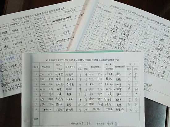 “自律咖”是参与“四自”工作学生的俗称。公寓院子里、大门的保安岗亭里、楼宇管理室里、楼层过道里,随处可见胸口贴着工作牌、胳膊上戴着“安全员”、“安全督查”红袖章的“自律咖”。他们已然融入了公寓的管理和服务中,成了这里的“主人”。一页页值班日志、一张张帮扶笔记,记录的是他们工作的过程。