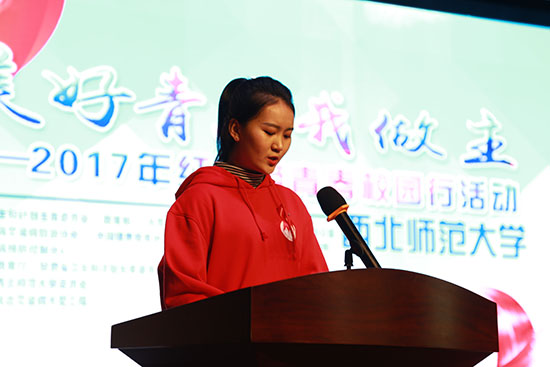 志愿者代表梁晶晶同学宣读了防艾倡议书,黄辉煌、薛景仁、余爱玲为西北师大“红丝带青春校园行”防艾青年志愿者团队授旗,田薇、康文婷与西北师大有关部门负责人、防艾志愿者代表共同启动本次活动,并宣布西北师大大学生防艾宣传月活动开幕。