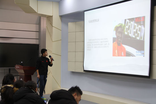 2016级运动训练本科生学生邱旺东同学以《我的马拉松生涯》为题,向同学们介绍他的长跑经历,并总结自身经验,对参与跑步运动的同学们提出“跑量不在多,而在精”等多方面建议,并号召广大同学“走出宿舍,走出网吧”,树立个人的奋斗目标,实现自己的个人梦想。