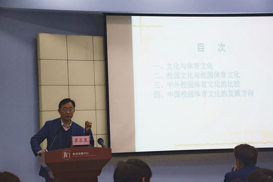 崔乐泉教授在题为《校园体育文化的传承与发展》的报告中,从体育文化出发,阐述了体育文化的本质是人通过体育活动在改造客观世界、在调节自身情感、在协调群体关系的过程中所表现出来的时代特征、地域风格和民族样式,以“以人为本”的中国体育文化为基础,指出当代中国校园体育文化应具有鲜明的时代特征、独特的文化地域风格与丰富多彩的民族特色。