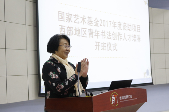 12月29日上午,国家艺术基金2017年度资助项目 “西部青年书法创作人才培养”在西北师大教师发展中心开班。全国政协委员、中国书法家协会顾问张改琴,甘肃省文化厅副厅长杨建仁,甘肃省文联副主席、中国书法家协会理事、甘肃省书法家协会主席林涛,甘肃省文史馆馆长李学春,甘肃省政协港澳台侨外事委员会副主任于树青,国家艺术基金评委库专家、甘肃省书协顾问马国俊、秦理斌、秋子和西北师大党委书记陈克恭、副校长田澍出席开班仪式。西北师大美术学院班子成员和来自陕西、甘肃、宁夏、广西、云南、贵州、四川、重庆、新疆、内蒙古等10个西部省、市、自治区20位学员参加开班仪式。