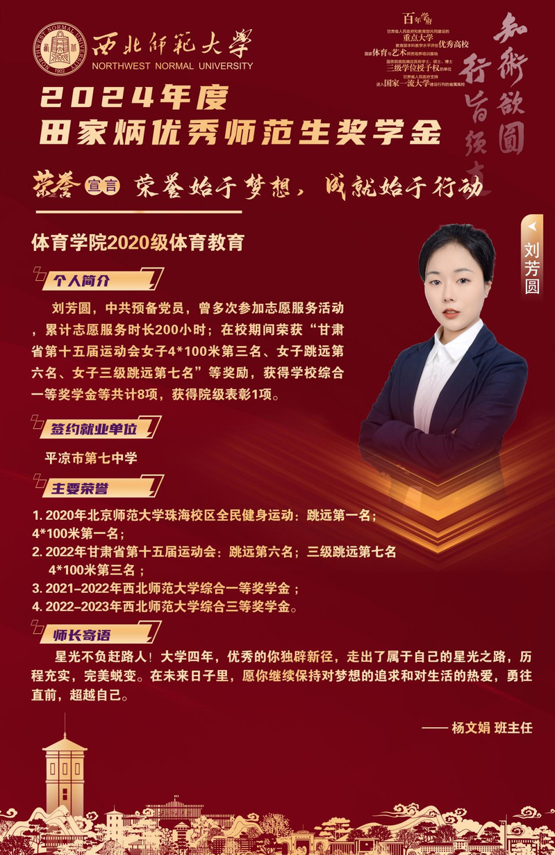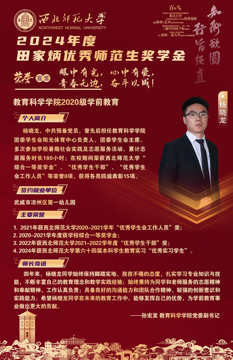 为树立“躬耕教坛 强国有我”的西北师大毕业生榜样,“田家炳优秀师范生奖学金”将荣誉赋予奔赴基层教育岗位的优秀毕业生,激励他们不断砥砺青春,续写华章。自本年度“田家炳优秀师范生奖学金”评选工作启动以来,经各学院推荐和资格审核,来自16个学院的48位优秀毕业生成为推荐候选人。其中参评一等奖、二等奖并进入最终答辩评审的22位优秀学子,他们敢于挑战,在科研领域勇攀高峰;他们无私奉献,用心用情服务师生;他们青春洋溢,在志愿活动中澎湃活力;他们脚踏实地,在扎根中国大地的教育使命中上下求索……