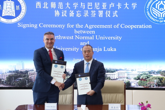 贾宁向贝尔扬大使促成双方教育合作交流所付出的工作致以最诚挚的感谢。他表示,西北师大建设的萨拉热窝大学孔子学院是波黑的第一所孔子学院,也是进行国际中文教育和中波文化交流的重要平台。此次贝尔扬大使积极推动波黑两校与西北师大建立校际合作关系,为双方在教育领域的交流合作开启了崭新篇章。今后,西北师大将以此次与波黑两校的签约为契机,在人才培养、师生交流、学术研究等领域开展更广泛的合作交流,在推动共建“一带一路”国际合作中发挥积极作用。