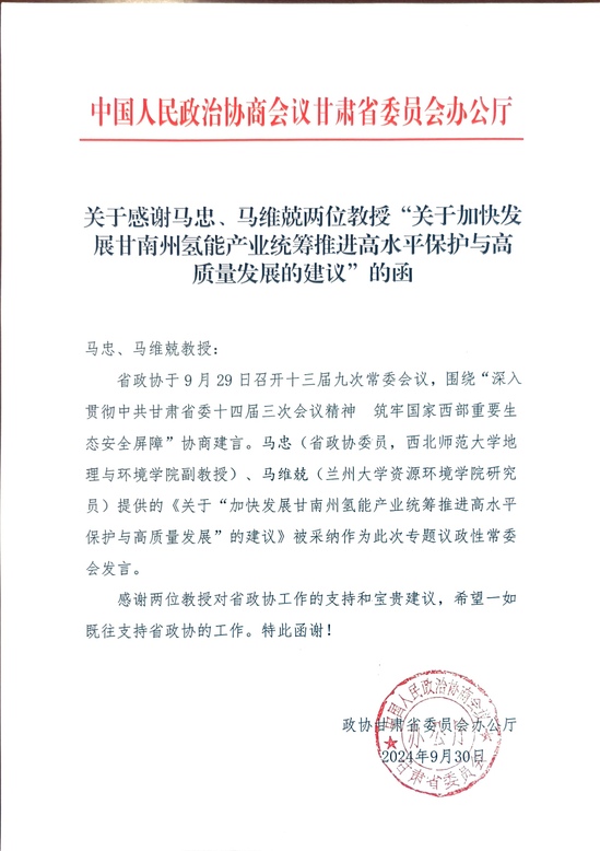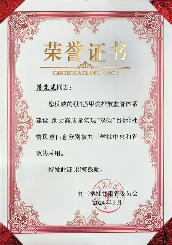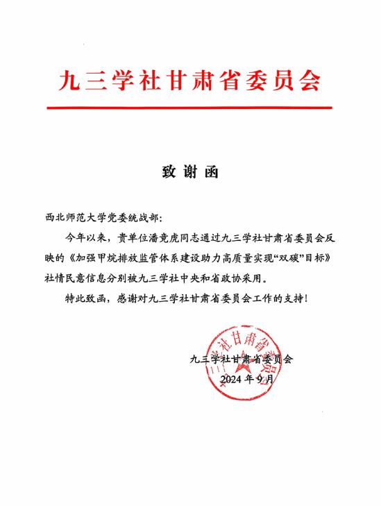 近日,九三学社西北师大基层委员会副主委、地理与环境科学学院教授潘竟虎,通过九三学社甘肃省委会反映的“加强甲烷排放监管体系建设 助力高质量实现‘双碳’目标”社情民意信息,被九三学社中央和省政协采用。民进西北师大支部主委、地理与环境科学学院副教授马忠提供的“关于‘加快发展甘南州氢能产业统筹推进高水平保护与高质量发展’的建议”,被省政协十三届九次常委会议采纳并列为专题议政性常委会发言。