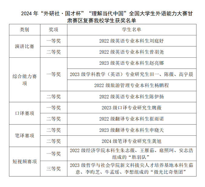 11月2日,由甘肃省教育厅主办,兰州财经大学、甘肃省大学外语教学研究会、外语教学与研究出版社承办2024“‘外研社·国才杯’理解当代中国”全国大学生外语能力大赛甘肃赛区复赛落下帷幕本次大赛涵盖英语演讲、综合能力、口译、笔译及短视频等5大赛项,经过激烈角逐,西北师大14名(组)同学获奖学校获大赛优秀组织奖。