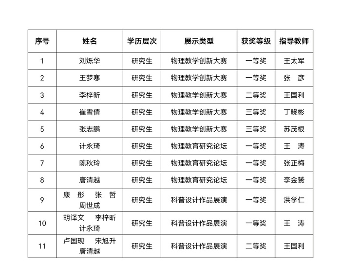 西北师大物理与电子工程学院选派11名物理教育研究所研究生参加比赛,经过物理教学创新大赛、物理教育与普及研究论坛及科普设计作品展示与讲演三大环节的激烈角逐,学校11名参赛选手全部获奖,其中一等奖7项、二等奖2项、三等奖2项,学校荣获优秀组织奖,是参加本项比赛以来的最好成绩。