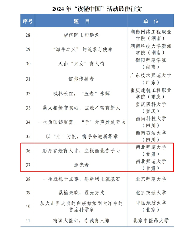 近日,教育部关心下一代工作委员会印发《教育部关工委关于公布2024年“读懂中国”活动入选作品名单的通知》。西北师大报送的征文作品《躬身杏坛育人才,立根西北赤子心》《追光者》入选最佳征文,微视频作品《退休不褪色的教育情怀》《文化传承和教育强国的践行者》入选优秀微视频。学校关工委获得通报表扬。