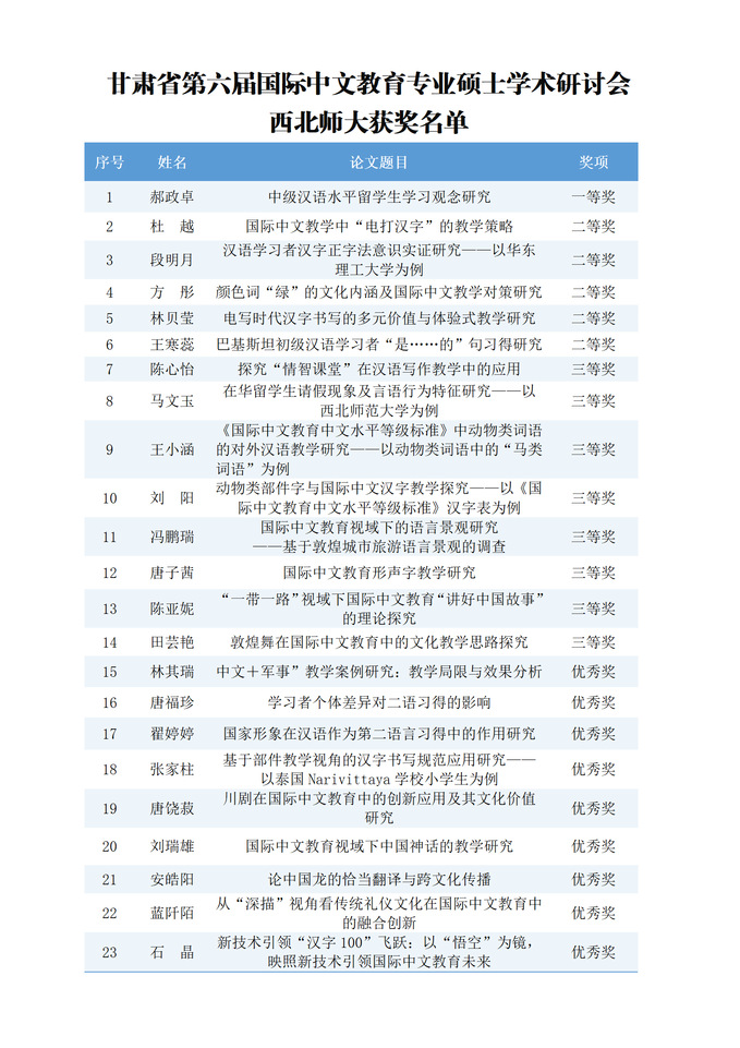 11月30日,由甘肃省学位与研究生教育学会指导,兰州交通大学承办的甘肃省第六届国际中文教育专业硕士教学技能大赛暨学术研讨会落下帷幕。经过激烈角逐,西北师大国际中文教育专业研究生许霄山、陈晶荣获中国选手组一等奖,国际中文教育专业研究生高子涵荣获中国选手组三等奖;国际中文教育专业罗佳琳荣获留学生选手组二等奖,王子文荣获留学生选手组三等奖;孙福婷、杨福亮荣获优秀指导教师;日韩人妻无码一区二区三区久久99_日韩精品一区二区三区中文在线_无码日韩精品一区二区免费_久久久91精品国产一区二区三区_亚洲精品久久久一区黄无码_国产91精品一区二区麻豆网站_成人国内精品久久久久影院荣获优秀组织奖。在学术研讨会上,各高校研究生围绕国际中文教育领域进行交流研讨并进行了论文评选。最终,西北师大国际中文教育专业研究生郝政卓荣获论文一等奖;杜越等5人荣获论文二等奖,陈心怡等8人荣获论文三等奖,林其瑞等9人荣获优秀论文奖。