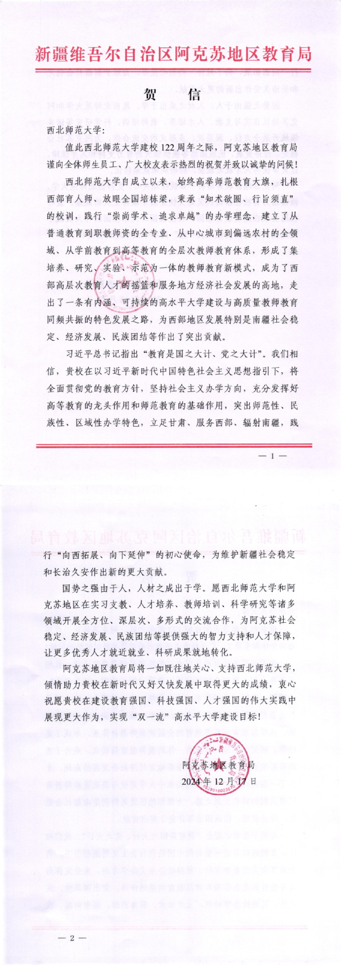 在西北师大建校122周年之际,阿克苏地区教育局向西北师大发来贺信,向全校师生及校友表达热烈的祝贺和诚挚的问候。