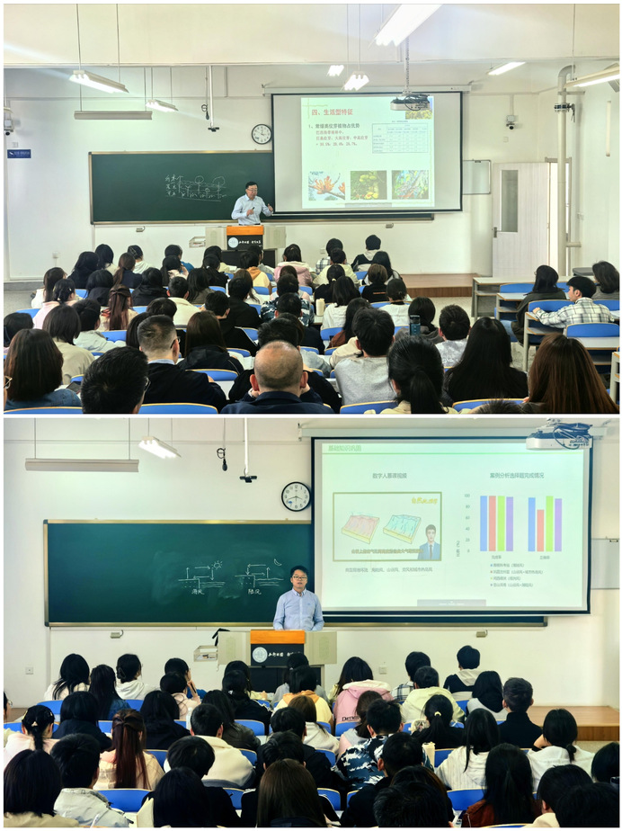 观摩现场,第二届全国高校教师教学创新大赛三等奖、甘肃省高校教师教学创新大赛一等奖获得者焦亮教授和王圣杰教授聚焦“学习者中心”理念,分别以《植物地理学》《自然地理学》为题作了教学展示。